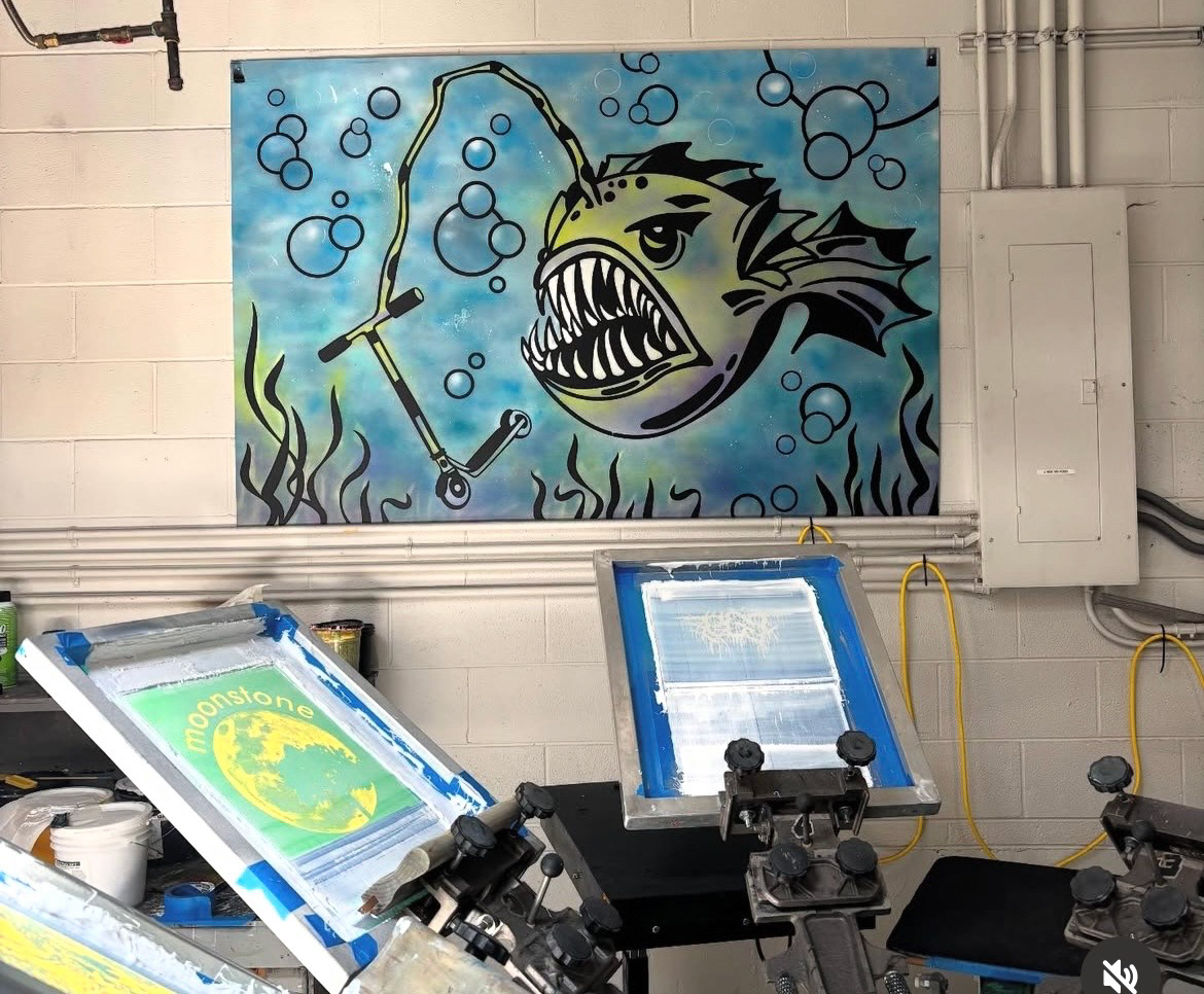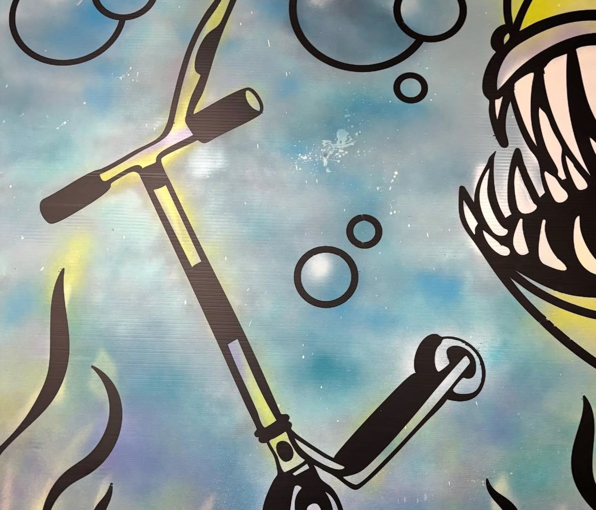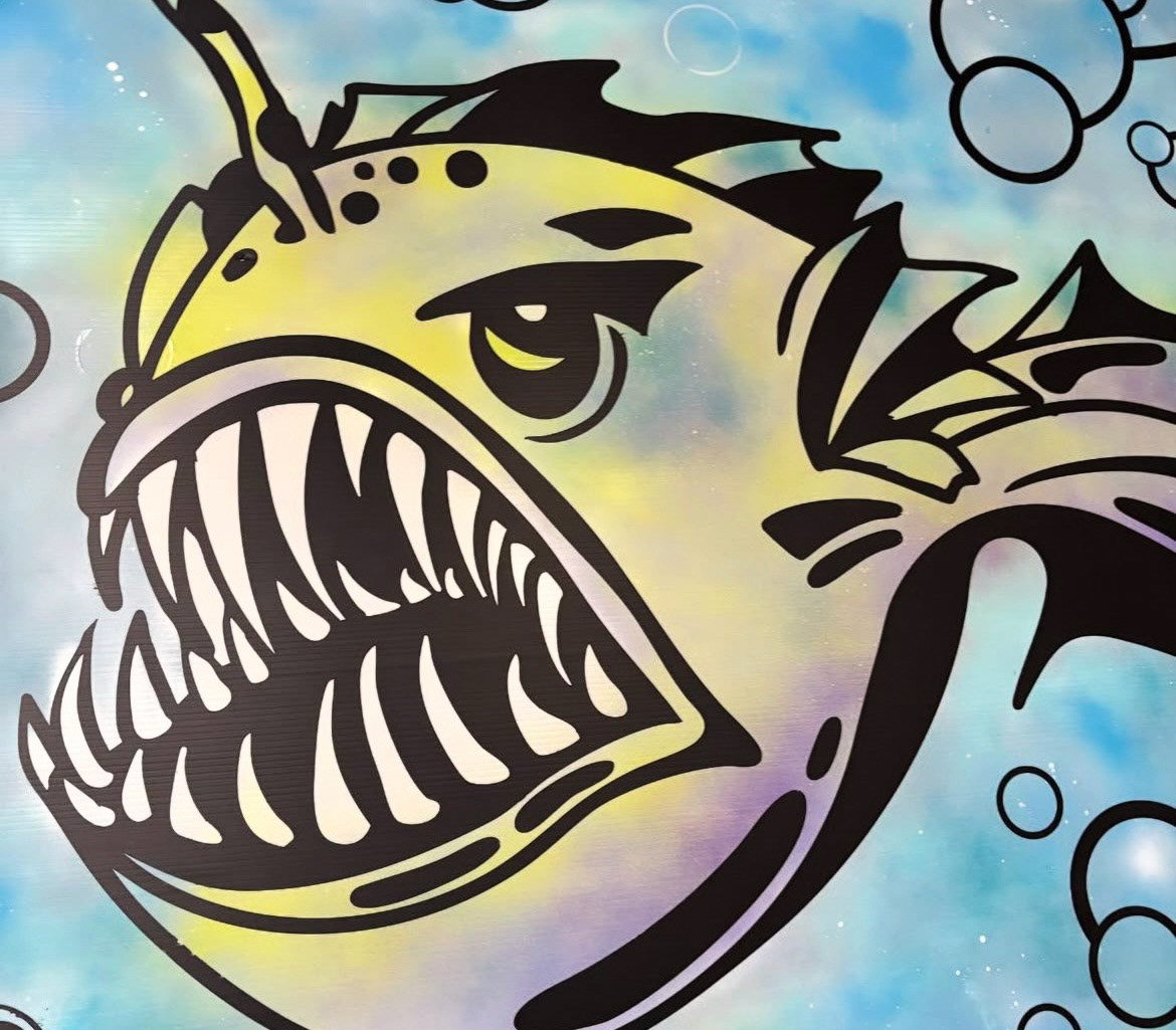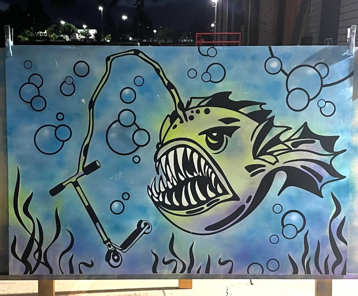 Mural board graphic I designed of an angler fish with a scooter as bait... at TH!S- Art, Print Design. For the 40 West Arts District August 2025 First Friday Art Walk Event